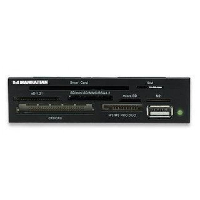 Converts an empty, unused PC bay into a digital content management center.The MANHATTAN Multi-Card Reader/Writer supports most card formats to easily download and transfer digital images and files from many of today’s popular flash memory cards without special adapters. Compatible with up to 62 types of CompactFlash, Microdrive, Magicstor, Memory Stick, MagicGate, SecureDigital, Multimedia, XD and more including SIM and Smart Cards, the MANHATTAN Multi-Card Reader/Writer quickly installs into a 3.5" bay. Included software easily reads, copies and edits text messages, phonebook entries and other content on SIM and Smart Cards.Convenience without the Media DeviceAccess digital content without directly connecting the camera, phone or other media devices to the computer. This convenient connection helps conserve battery power by eliminating the need to directly install a digital device to a desktop computer. A front-mount USB port expands power availability to recharge USB devices or expand USB connectivity.
